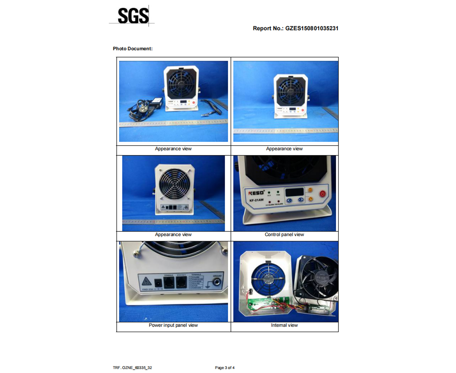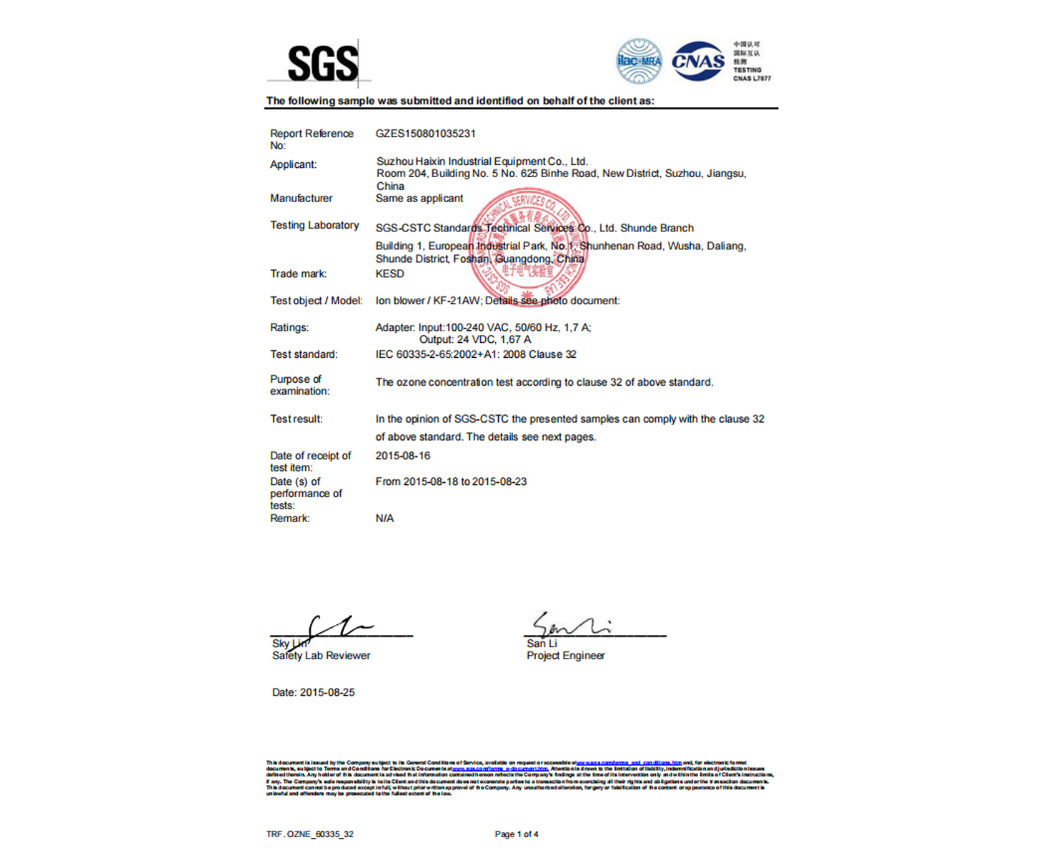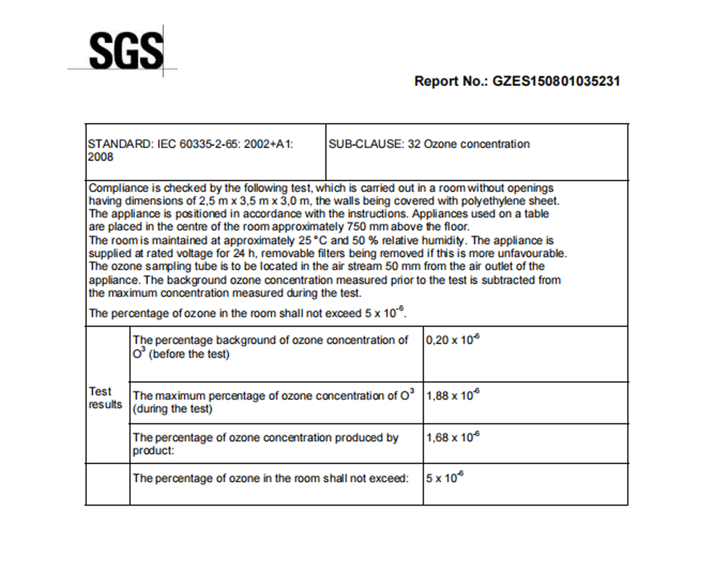 KESD离子风机臭氧浓度测试SGS报告